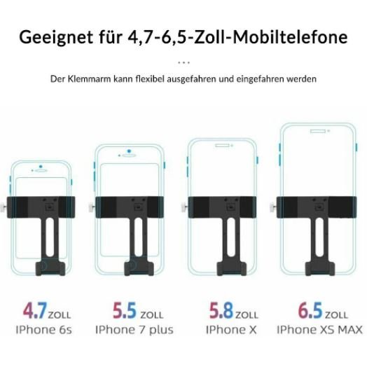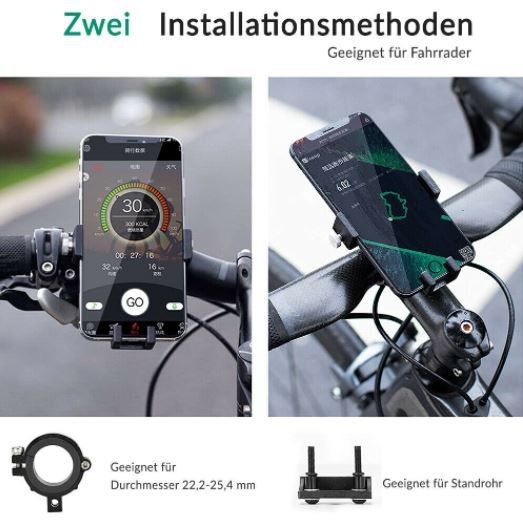 Подходящ за мобилни телефони от 4,7 до 6,5 инча. Нашият държач за мобилен телефон се използва широко в велосипеди, електрически велосипеди и мотоциклети. (Диаметър на кормилото 22,2-25,4 mm.)