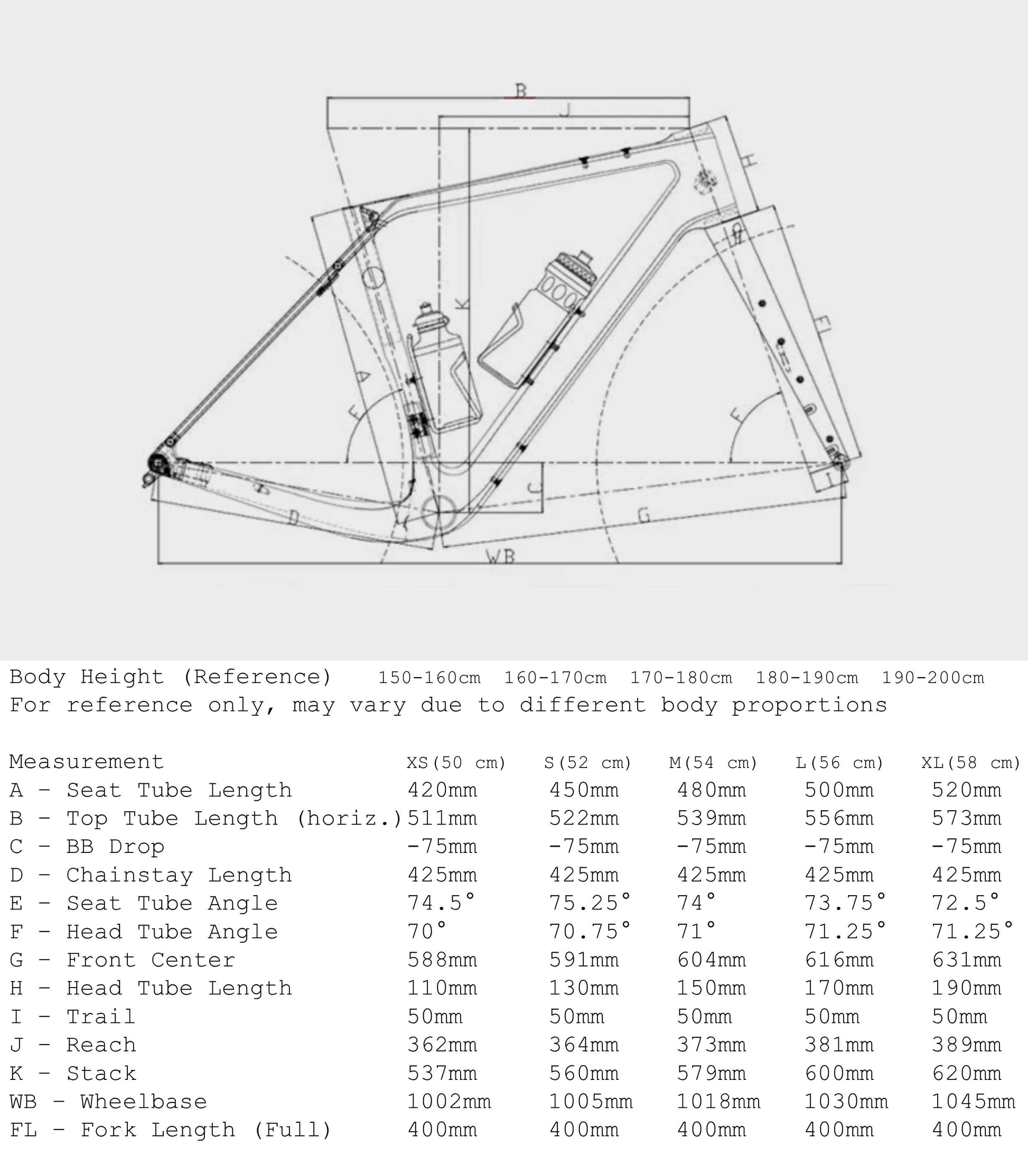| Височина на велосипедиста за рамка 50 см | 155-170 см |