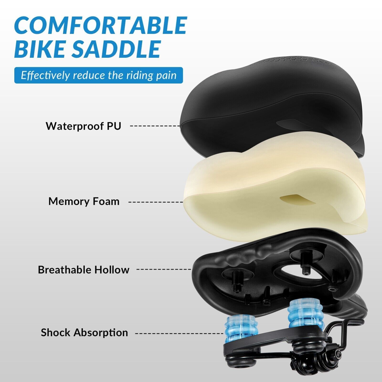 Удобно седло: Външният слой на това велосипедно седло е изработен от PU, който е не само водоустойчив, но и издръжлив и лесен за почистване. Вътре е използвана високоеластична 50мм мемори пяна, която е много еластична и удобна. Осигурете ви комфортно изживяване при каране на велосипед.