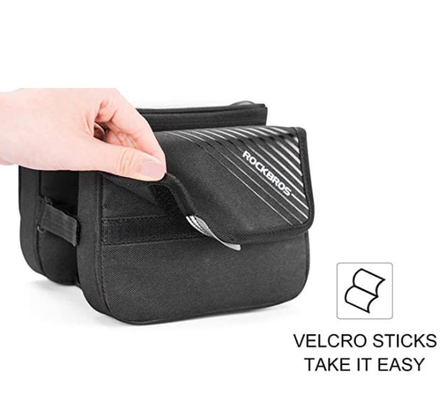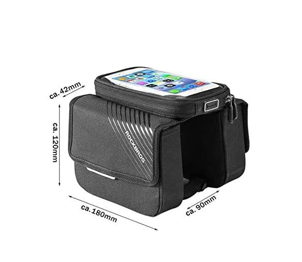 1+2 джоба Дизайн: < /strong> Тази рамкова чанта се състои от 3 джоба (1 подвижен джоб за мобилен телефон + 2 странични джоба). Ето защо тази рамкова чанта има голям капацитет, можете да поставите много неща в нея, например инструменти, портфейл, ключове и др. Размери на джоба за мобилен телефон: прибл 180*120*42 мм