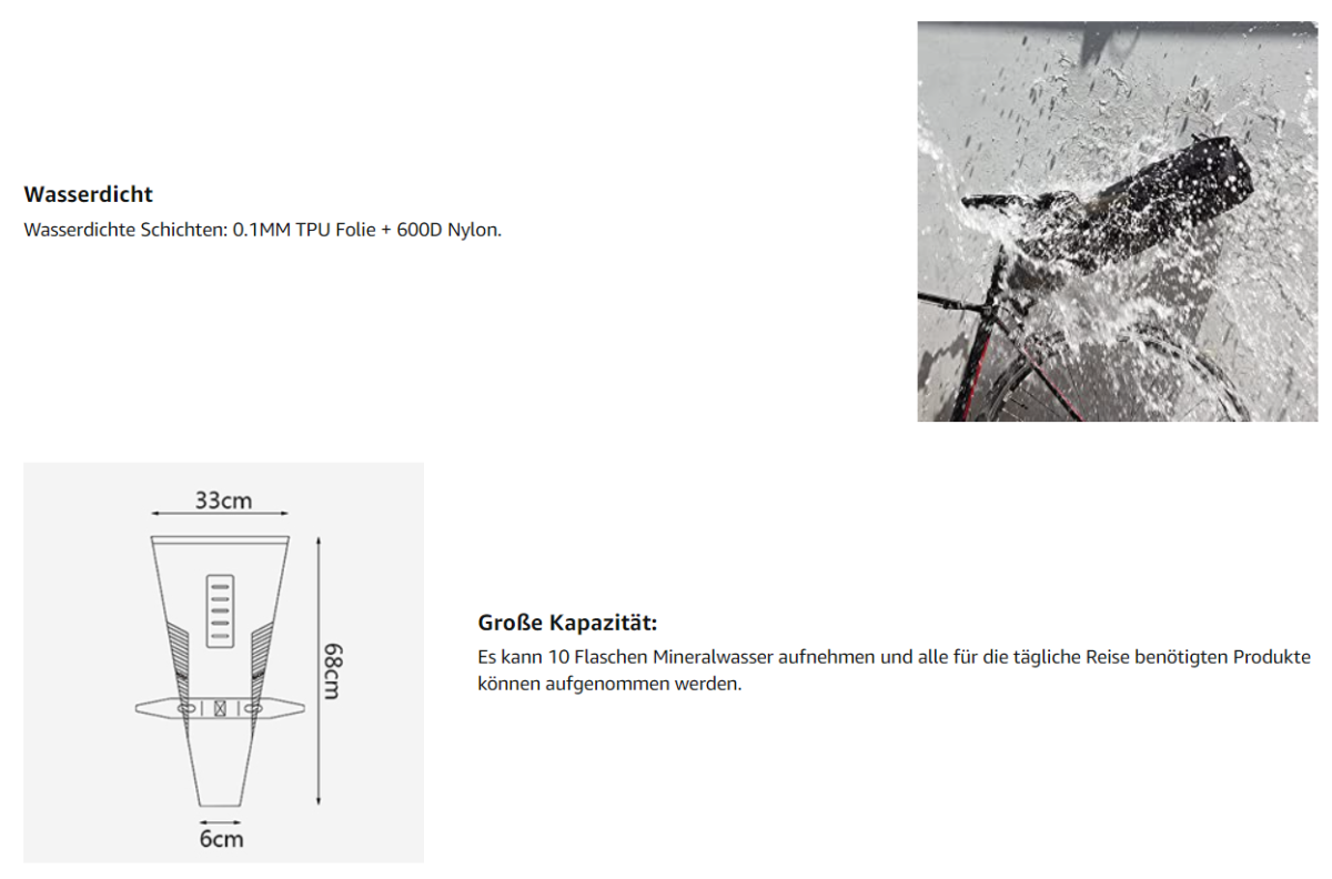 ВОДОУСТОЙЧИВОСТ И БЕЗОПАСНОСТ: Три водоустойчиви слоя. Първият филм е 0,1MM TPU филм, вторият филм е 600D найлон и последният филм е високочестотен синтез. Безопасността е повишена благодарение на светлоотразителните ленти.