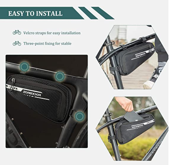 СТАБИЛЕН МОНТАЖ: Чантата за рамката на велосипеда има 3 ремъци, които могат да се прикрепят към гумата на велосипеда. 3-те презрамки са пришити на велосипедната чанта и могат да я поддържат стабилна.